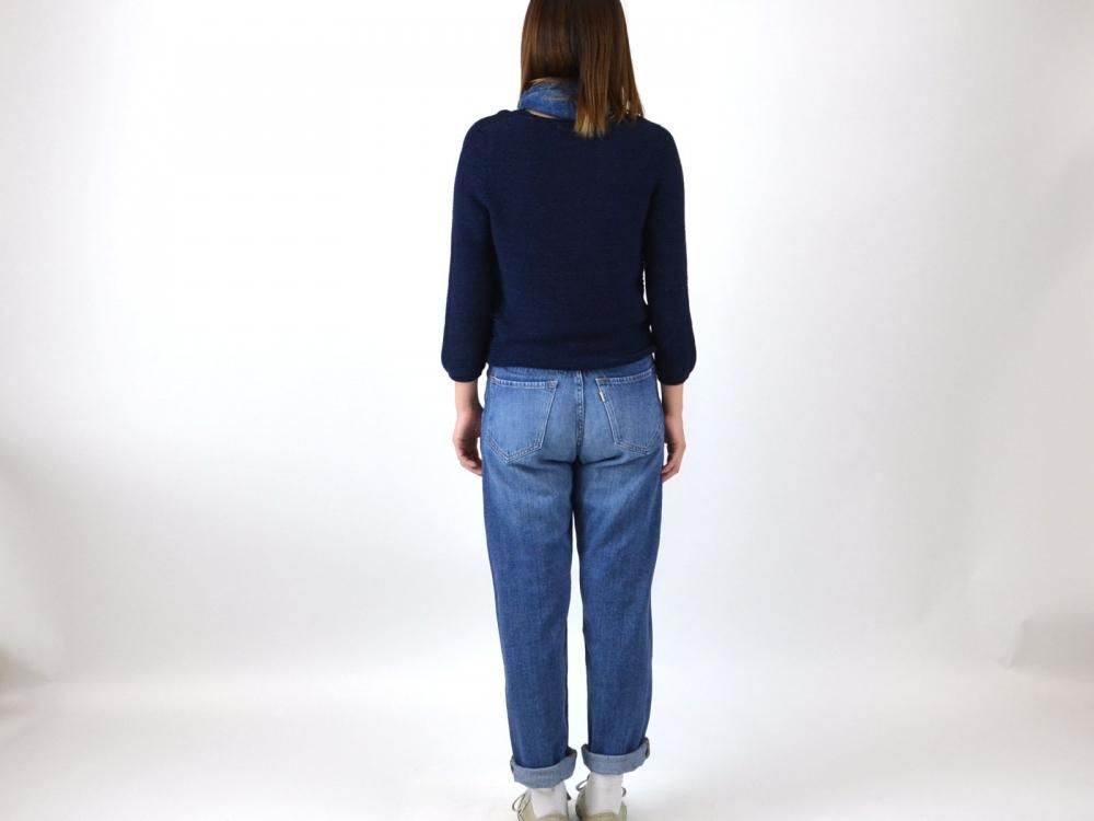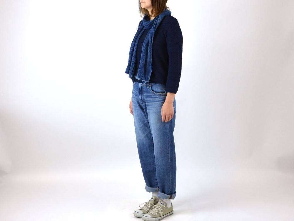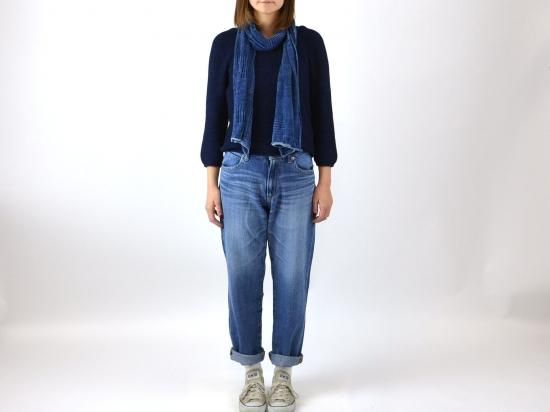 パッチワーク柄のインディゴストールを、贅沢にもユーズド加工にしました。